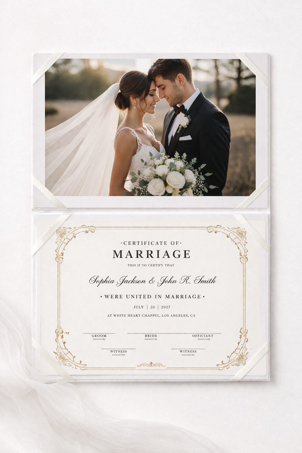 Inside features two document corners secured with satin ribbon, designed to hold documents or photos up to: A4 (210 × 297mm) or US Letter (8.5 × 11 inch)